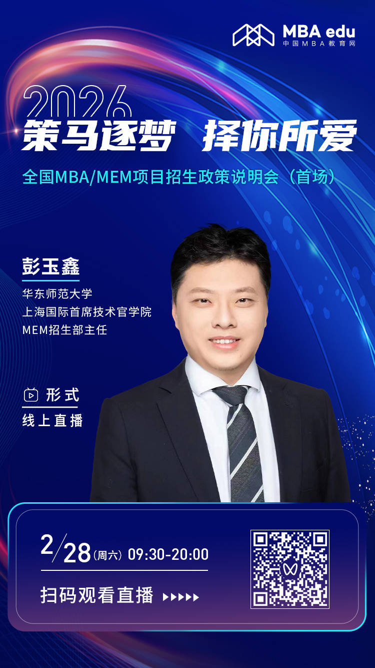 为助力广大考生获取一手资讯,把握2026年入学机遇,2月28日(周六)9:30,由中国MBA教育网主办的“策马逐梦 择你所爱——2026全国MBA/MEM项目招生政策说明会(首场)” 即将盛大开启。本次说明会特邀全国30多所知名MBA/MEM培养院校的主管院长、项目主任、招生主管莅临直播间,就考生关心的热点问题进行深入交流与解答。