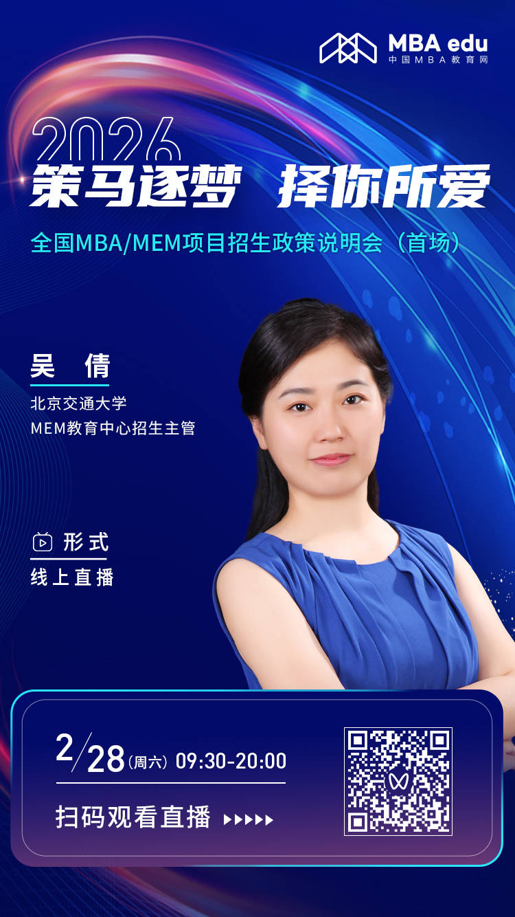 为助力广大考生获取一手资讯,把握2026年入学机遇,2月28日(周六)9:30-20:00,由中国MBA教育网主办的“策马逐梦 择你所爱——2026全国MBA/MEM项目招生政策说明会(首场)” 即将盛大开启。本次说明会特邀全国30多所知名MBA/MEM培养院校的主管院长、项目主任、招生主管莅临直播间,就考生关心的热点问题进行深入交流与解答。